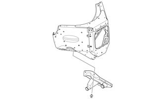 6.Remove all Torx-head screws securing the front skid plate to the chassis; then remove the cap screw and nut securing the steering arm to the chassis. Account for two washers and two bushings.