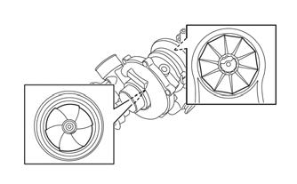 NOTE: If any damage to the compressor or turbine blades is present, the turbocharger must be replaced.