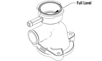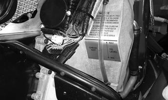13.Install the oil tank plug then start the engine and let it idle. The oil pressure warning icon may illuminate briefly after starting but should go out within 10 seconds. If the icon does not go out within 10 seconds, the engine will automatically shut down. If a shutdown occurs, check that there are no leaks and that oil has been added to the oil tank before trying to start the engine again. If the engine shuts down automatically, the key will have to be turned off for 5 seconds before the engine can be restarted. 14.Shut the engine off; then allow the engine to cool; then look at the oil level tube on the backside of the oil tank. The oil should be above the MIN line but not above the MAX line.