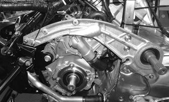 REMOVING 1.Drain the engine coolant. 2.Remove the drive clutch, drive belt, driven clutch and the clutch guard. 3.Remove the cap screws and nuts securing the left-side chassis support; then carefully tip the support up to gain clearance to the water pump. 4. Disconnect all hoses from the water pump; then remove the allen-head screws securing the water pump assembly to the crankcase; then remove the assembly. Account for two dowel pins and two gaskets.