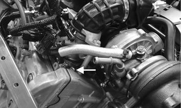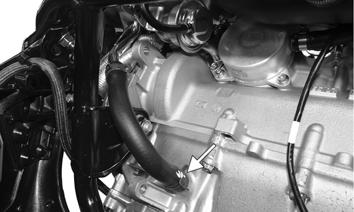 3.Secure the oil return hose to the crankcase using the existing clamp; then secure the oil delivery hose to the cylinder using the existing banjo bolt and new washers. Tighten to 7.2 ft-lb.