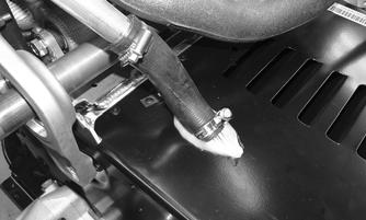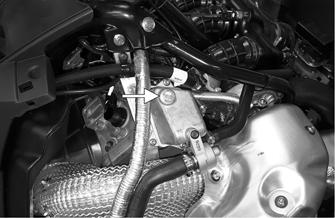 The liquid cooling system consists of a heat exchanger, water pump, and thermostat. The system should be inspected for leaks or damage whenever an overheating problem is experienced. DRAINING COOLING SYSTEM 1.Remove both access panels and the hood; then using a vacuum pump, remove as much coolant as possible from the coolant filler neck. 2.Remove the exhaust resonator; then remove the resonator. 3.Remove the hose clamp from the coolant hose connecting the water pump to the right side of the heat exchanger. With a drain pan positioned under the coolant hose, remove the hose from the water pump and tip the hose downward allowing the coolant to drain completely. 4.Apply 0.35-0.56 cm² (5-8 psi) to the coolant system through the coolant overflow tube and continue until the coolant stops draining from the system. FILLING/BLEEDING COOLING SYSTEM NOTE: The snowmobile should be on level ground