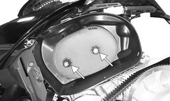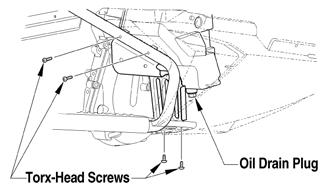 1.Park the snowmobile on a level surface; then start the engine and let it idle and warm up until it reaches operating temperature, or if the snowmobile was operated, allow the engine to idle for approximately 30 seconds. Shut off the engine. 2.Remove the Torx-head screws and the rear access plate from beneath the snowmobile. 3.Place a drain pan beneath the engine oil drain screw; then remove the screw and allow the oil to drain completely.