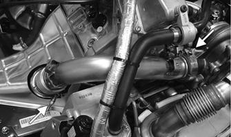 9.Remove the hose clamp securing the coolant hose to the vapor tank; then remove the hose clamp securing the coolant hose from the bottom of the turbo.