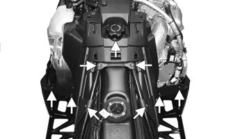 The oil and coolant should be drained before removing the turbocharger. 1.Remove both access panels; then loosen the two quarter-turns securing the hood. Disconnect the hood harness and pull the hood forward and off of the snowmobile. 2.Remove the seat; then remove the gas cap and retaining nut from the neck of the gas tank. Remove the eight screws securing the console. Remove the console.