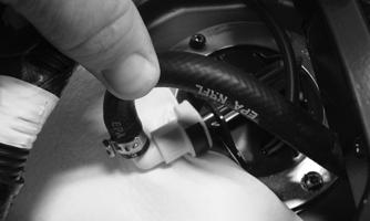 2.Remove the seats and tool tray; then disconnect the battery. 3.Remove the storage compartment cover, front storage compartment, and side panels. 4.Loosen the clamps securing the air filter housing boot to the throttle body inlet and air box; then remove the boot from the throttle body. 5.Disconnect the IAT sensor connector from the air box. Remove the spark plug cap from the spark plug; then disconnect the primary lead from the ignition coil. Remove the crankcase breather hose from the bottom right side of the air box; then remove the air box assembly. 6.Slowly disconnect the fuel hose connector from the fuel rail. ! WARNING