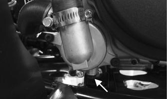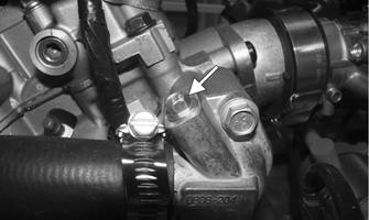 4.Fill the cooling system with the recommended amount of antifreeze (see Periodic Maintenance/Tune-up). Check for leakage. 5.Loosen the bleed screw on top of the thermostat housing to allow any trapped air to escape. Check coolant level in radiator neck. This process may need to be repeated.