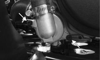 Installing 1.Secure the water pump to the engine with the two cap screws tightened securely. Tighten securely to 8.5 ft-lb (11.5 N-m). 2.Connect the two coolant hoses to the water pump and secure with the clamps. Tighten securely. 3.Install the left side footwell and left side engine covers. 4.Fill the engine/transmission with the proper amount of recommended oil. 5.Fill the cooling system with the proper amount of recommended coolant (see Periodic Maintenance/Tune-up). Check for leaks.