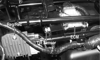 6.Note the wire harness routing of the ECM, Tilt Sensor, and Regulator/Rectifier. Remove the fasteners securing each component to the frame; then position each component up and out of the way.