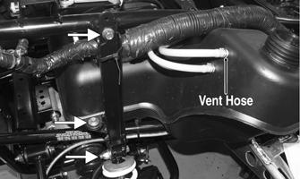 2.Remove the rear rack and rear body panel (see Steering/Body/Controls). 3.Remove the upper cap screw securing the support bracket to the frame and the cap screw securing the gas tank to the support bracket. Loosen the upper shock mount bolt and pivot the support bracket down; then remove the vent hose from the gas tank.