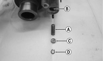 Disassembling Input Shaft 1.Remove the actuator (see Front Drive Actuator section). 2.Remove the slotted aluminum plug and account for the O-ring. Remove the differential locking shaft circlip. Account for the circlip, spring retainer, and spring. Note the orientation of these components for assembly purposes.