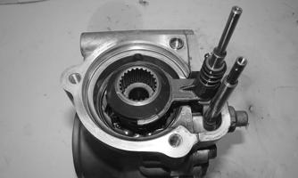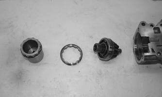 4.Remove the splined coupler, shifter fork, pin, and springs of the differential lock assembly and set aside. Note position of parts for assembling purposes.