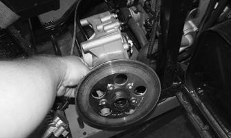 8.Use a tie-down to hold the steering knuckle and brake caliper up and out of the way.