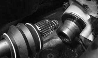 9.Position the axle horizontally and grasp the axle mid shaft; then push the axle slightly in toward the differential. Using a slide hammer type action, pull the axle out from the differential. Remove the axle from the differential. Repeat for the opposite side.