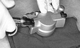 3.Apply high-temperature silicone grease to the inside of the caliper holder bores, O-rings, and boots. 4.Install the caliper onto the caliper holder making sure the caliper and holder are correctly oriented. NOTE: It is very important to apply silicone grease to the O-rings, boots, and caliper bores prior to assembly.