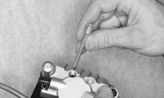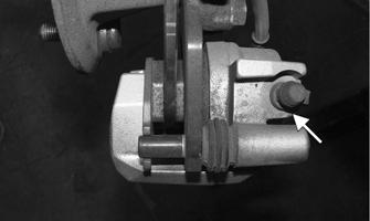 2.Remove the rubber plug covering the bleed screw; then attach a drain hose to the bleed screw. Loosen the bleed screw; then drain the brake fluid from the caliper, hose, and master cylinder through the bleed screw by pumping the brake pedal.