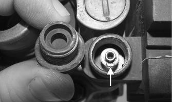 7.Cover the piston end of the housing with a shop towel; then keeping fingers clear of piston travel.