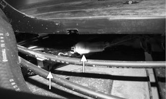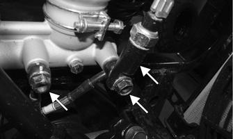 2.Remove the front left splash panel; then remove the two banjo bolts securing the brake switch and banjofittings to the master cylinder.