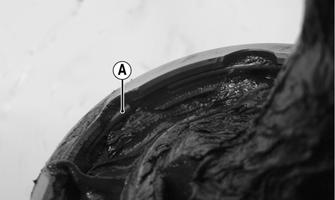 NOTE: For measuring brake pads, see Periodic Maintenance/Tune-Up - Hydraulic Brake System. 3.Inspect the brake caliper housings for scoring in the piston bores, chipped seal ring grooves, or signs of corrosion or discoloration. 4.Inspect the piston surface for scoring, discoloration, or evidence of binding or galling. 5.Inspect the caliper holder for wear or bending. ASSEMBLING/INSTALLING 1.Install the new piston seal (A) into the brake caliper housing and apply a liberal amount of DOT 4 brake fluid to the cylinder bore of the housing, seals, and brake piston. Place the new dust seal onto the piston (B).