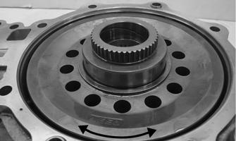 B.While holding the pinion gear shaft, place a horizontal type dial gauge through the filler hole and against the ring gear. Rotate the pinion gear shaft back and forth; then record the reading from the dial gauge.