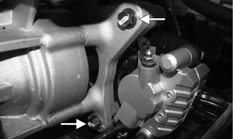 NOTE: Whenever brake components are removed, disassembled, or repaired where brake fluid is exposed to air, drain all fluid and replace with new DOT 4 brake fluid from an unopened container. Brake fluid readily absorbs moisture from the air significantly lowering the boiling point. This increases the chance of vapor lock reducing braking power and increasing stopping distance. 3.Remove the brake hose (discard the crush washers) from the caliper and close the bleed screw; then remove the caliper. 4.Remove the brake pad pins.