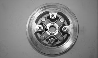 INSTALLING 1.Secure the brake disc to the hub (front) with the four cap screws or to the rear input shaft with five cap screws coated with red Loctite #271. Tighten to 25 ft-lb (34 N-m). 2.Apply grease to the splines of the front hub. If installing the rear brake disc, at this point reinstall the rear gear case (see INSTALLING).