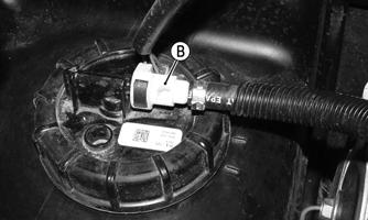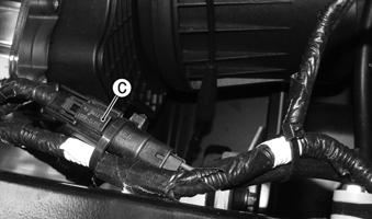 1.Place the gas tank into position in the vehicle; then connect the vent hose (A), gas hose (B), and fuel pump/gas level sensor connector (C).