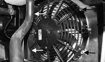 2.Remove the four cap screws securing the fan to the radiator fan bracket; then remove the fan from the radiator.