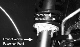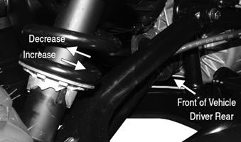 Each shock absorber should be visibly checked weekly for excessive fluid leakage (some seal leakage may be observed but it does not indicate the shock is in need of replacement), cracks or breaks in the lower case, or a bent shock rod. If any one of these conditions is detected, replacement is necessary. NOTE: When the vehicle is operated in extremely cold weather (-23° C/-10° F or colder), a small amount of leakage may be present. Unless the leakage is excessive, replacement is not necessary. This vehicle is equipped with adjustable shock assemblies in the front and rear to allow for different driving and loading conditions. The front shock absorbers have an adjustment sleeve with five preload adjustment positions that can be turned with the spanner wrench to increase or decrease coil spring tension. NOTE: The softest setting is as shown.