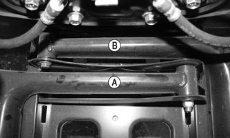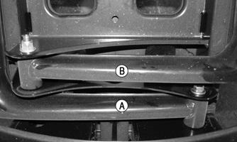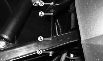 The lower rear A-arm bolts must be installed with the driver-side A-arm (A) cap screw threads toward the rear of the vehicle and the passenger-side A-arm (B) cap screw threads toward the front of the vehicle as shown. Failure to do so will result in suspension component damage.