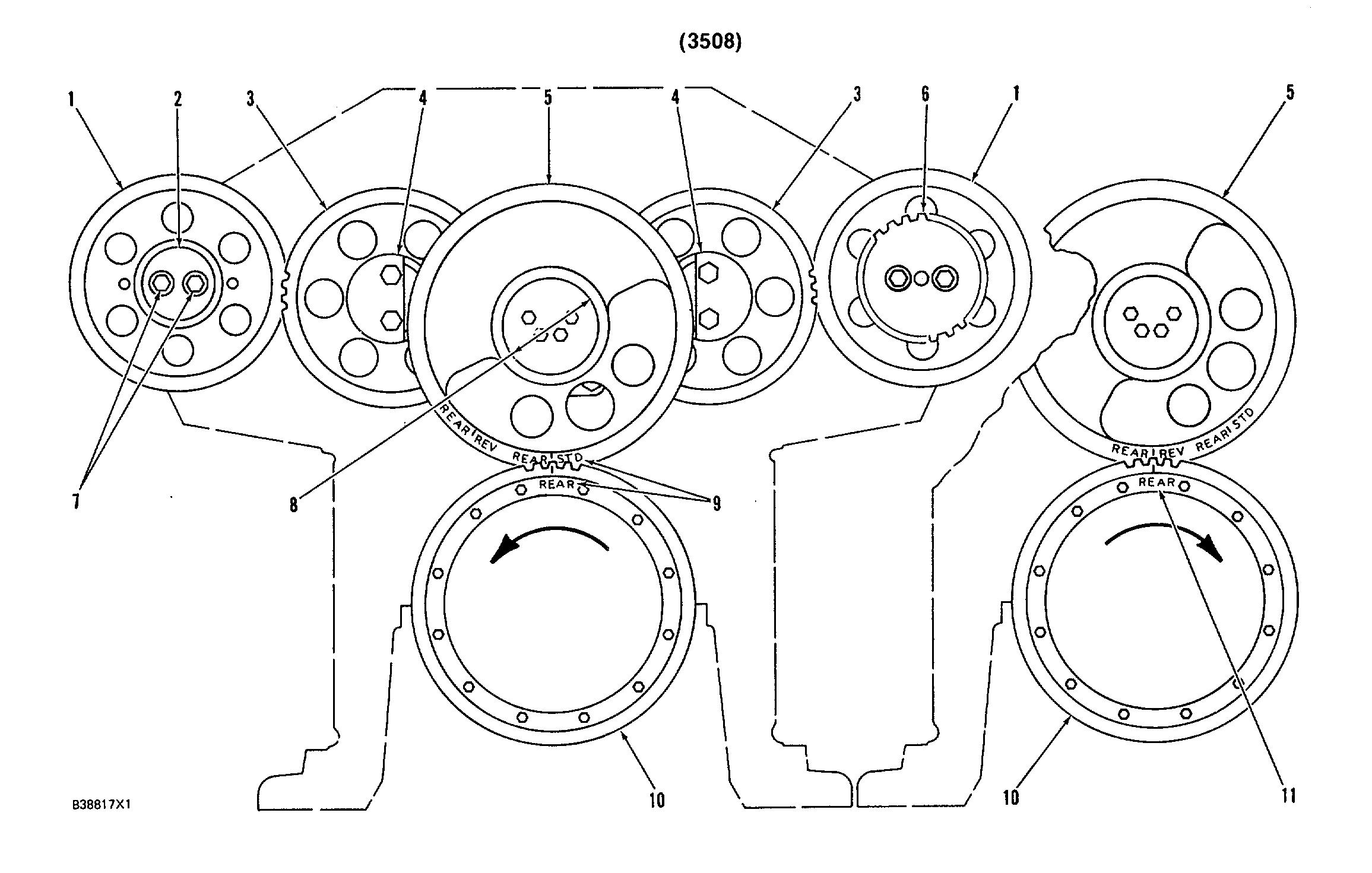 (1) Camshaft drive gears. (2) Plate. (3) Camshaft idler gears. (4) Diameter of shafts (new) 74.900 + 0.015 mm (2.9488 + .0006 in ) Bore in bearings (after assembly) ..................................75.000 0.055 mm (2.9528 + 0022 in.) (5) Cluster idler gear. (6) Gear for hydramechanical protective system drive. (7) Bolts. Tighten the bolts as follows: a. Put camshaft drive gears (1) in position on the camshafts. b. Use hand pressure to turn and hold camshaft drive gears (1) in their normal direction of rotation. This removes all gear clearance (backlash) between camshaft drive gears (1) and camshaft idler gears (3). c. Install plate (2) (on left side of engine) and/or drive gear (6) (on right side of engine) to hold camshaft drive gears (1) to each camshaft. d. Tighten bolts (7) in steps to a torque of of 100 ±15 N-m (75 + 11 lb. ft.) e. Hit the face of plate (2) or drive gear (6), then tighten the bolts to a torque of 100 f 15 N-m (75 ± 11 lb. ft.) f. Again hit the face of plate (2) or drive gear (6) and again tighten the bolts to a torque of ............................100 15 N-m (75 + 11 lb. ft.) NOTE: If necessary, repeat Step 7f until the bolts hold torque (can not be moved) to make sure the drive gears are in full contact with the taper on the camshafts.