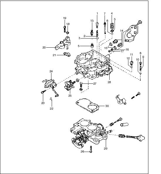 1.Discharge weight 2.Spring 3.Check ball 4.Plunger spring 5.Retainer 6.Check ball 7.Primary slow jet 8.Plug 9.Spring 10.Ball 11.Plug 12.Ball 13.Power valve 14.Passage plugs 15.Gaskets 16.Primary main jet 17.Gasket 18.Passage ring 19.Screw 20.Primary small venturi 21.Gasket 22.Snap ring 23.Screw 24.Fast idle cam breaker (FICB) 25.Fast idle cam 26.Passage screw 27.Bolt 28.Carburetor Body 29.Carburetor flange 30.Insulator