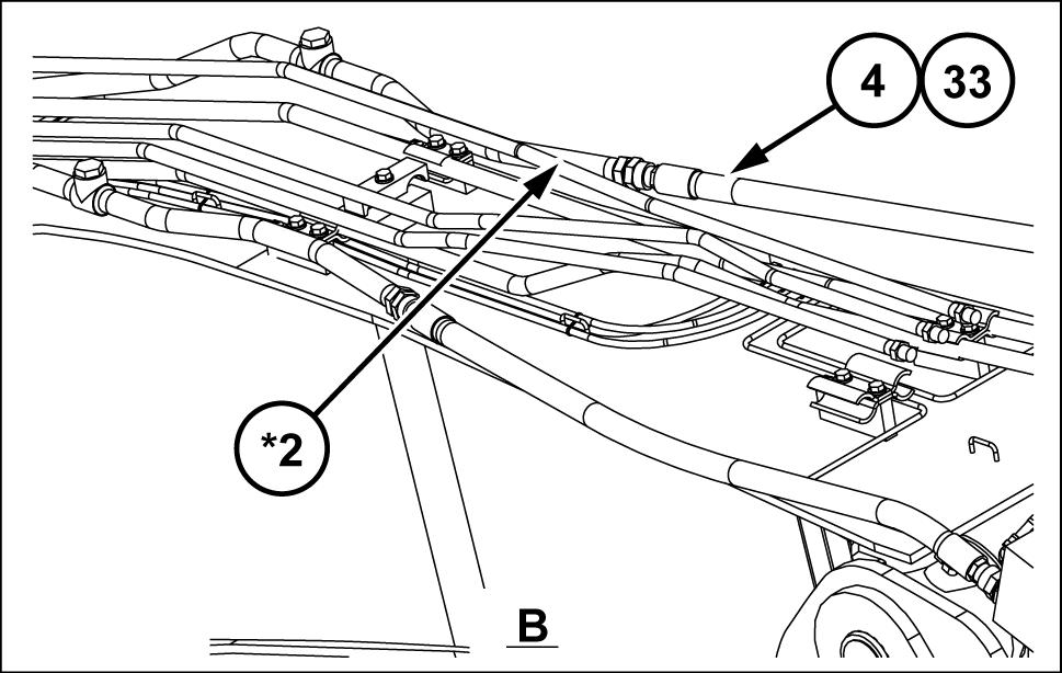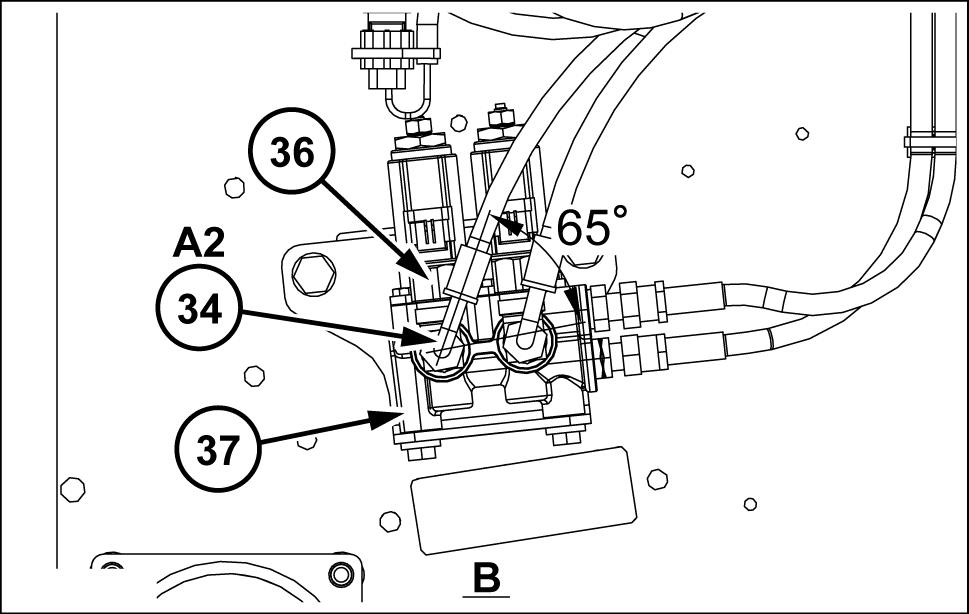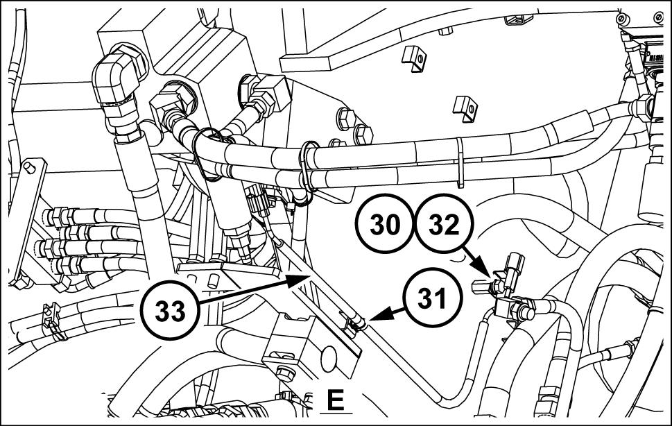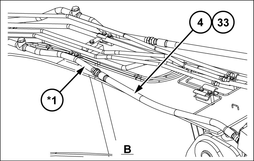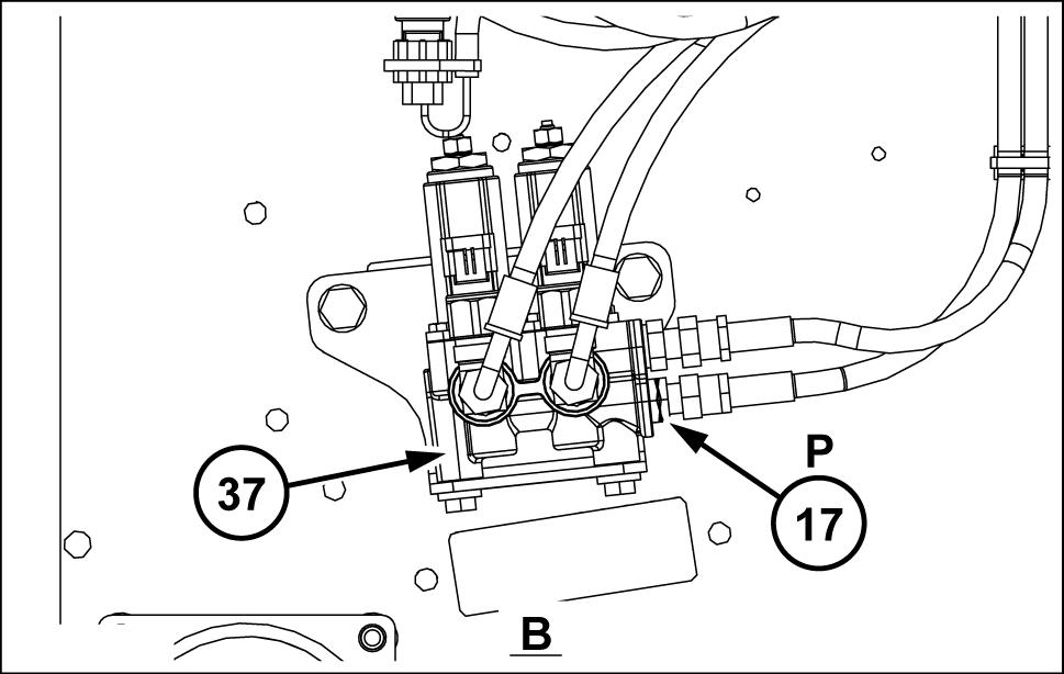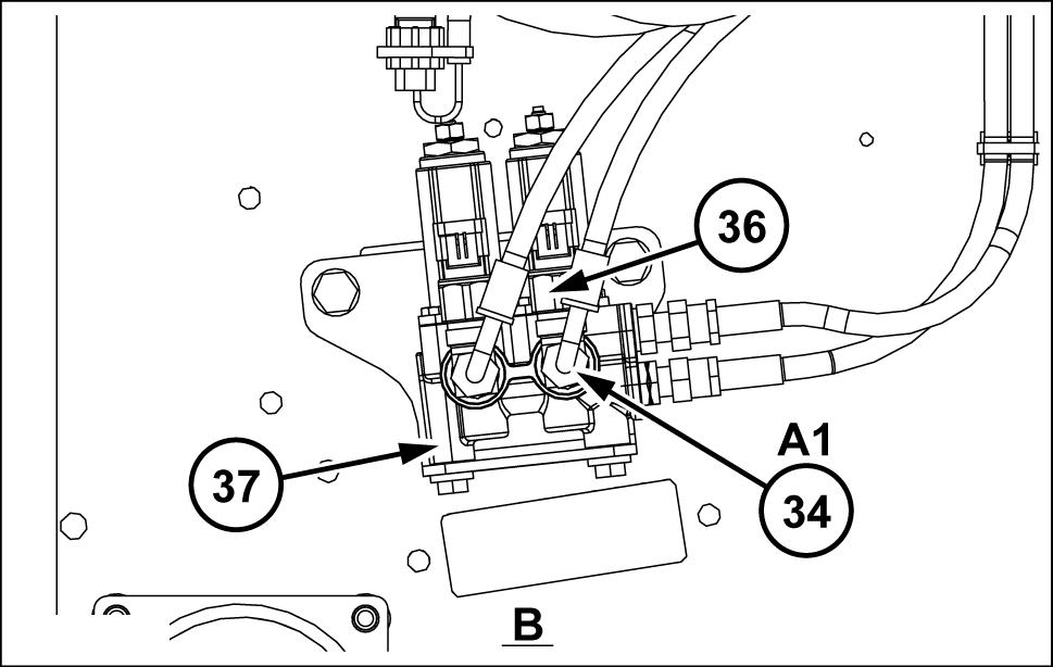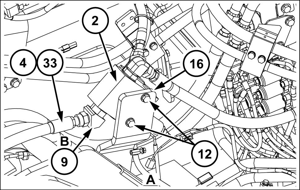 Instale codo (9) toma B válvula ridad proporcional electromagnética (2) Coloque junta tórica (4) codo (9) y conecte manguera hidráulica (33) .