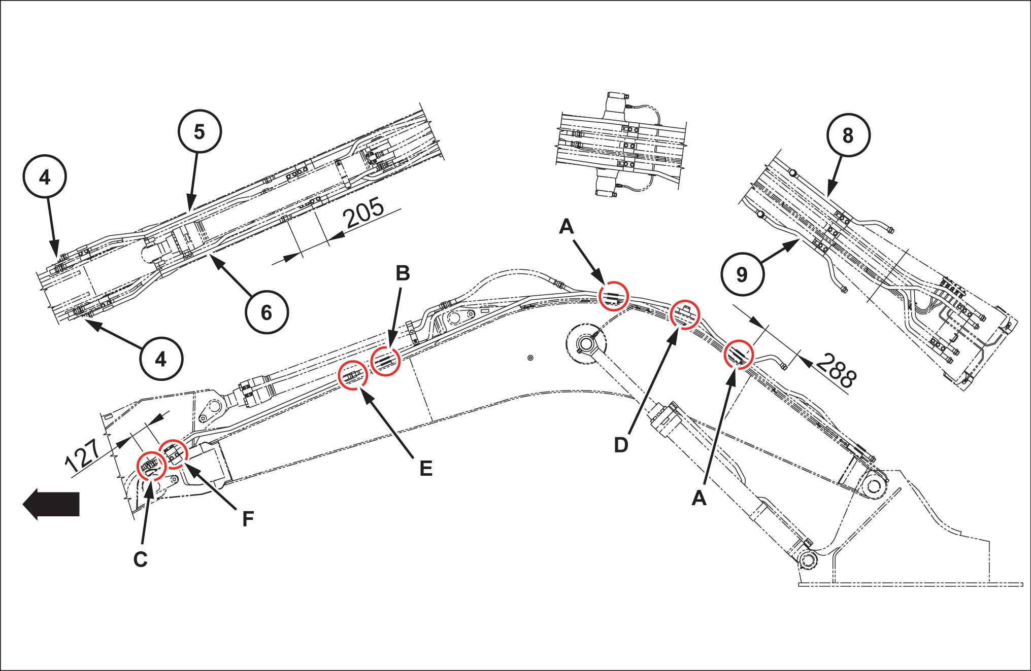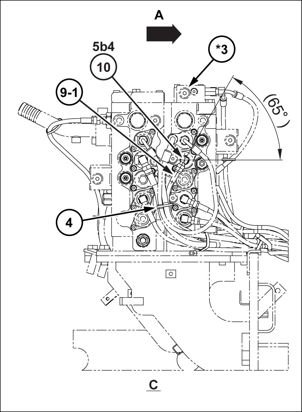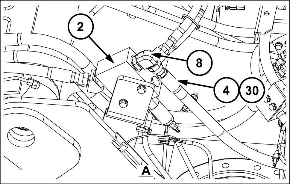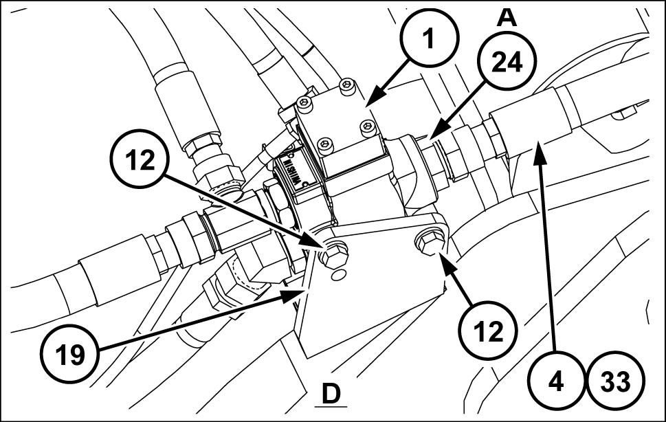 Instale codo (9) toma B válvula ridad proporcional electromagnética (2) Coloque junta tórica (4) codo (9) y conecte manguera hidráulica (33) .