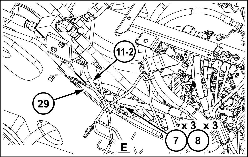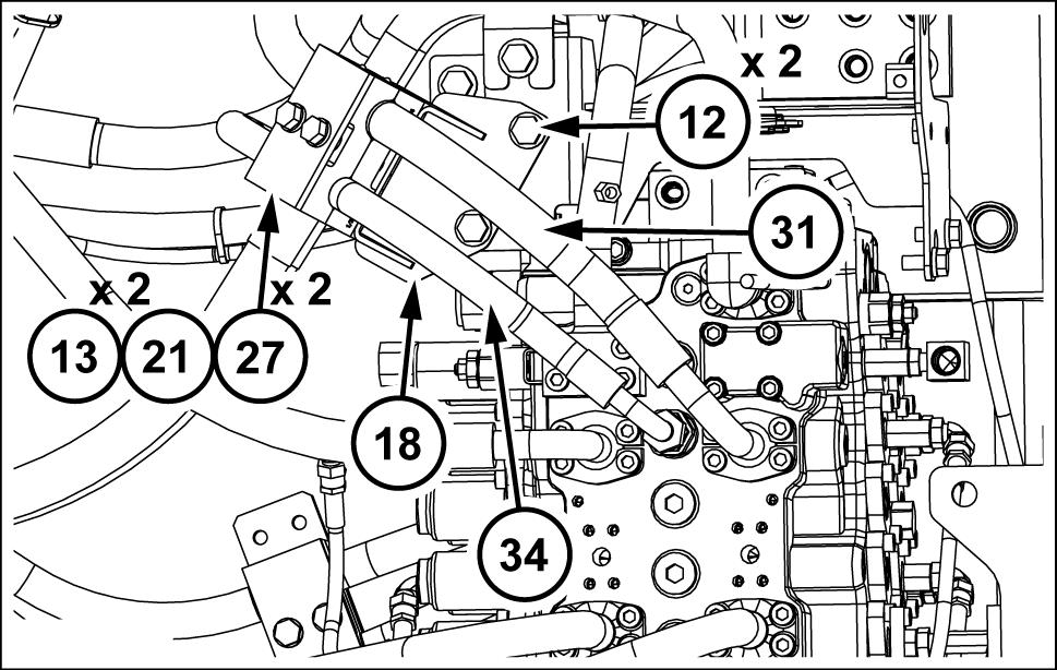 Instale soporte (18) soporte con dos pernos SEMS (12) . Sujete las mangueras hidráulicas (31) y (34) con dos abrazaderas manguera (27) y sujételas con placa (21) y dos pernos SEMS (13)