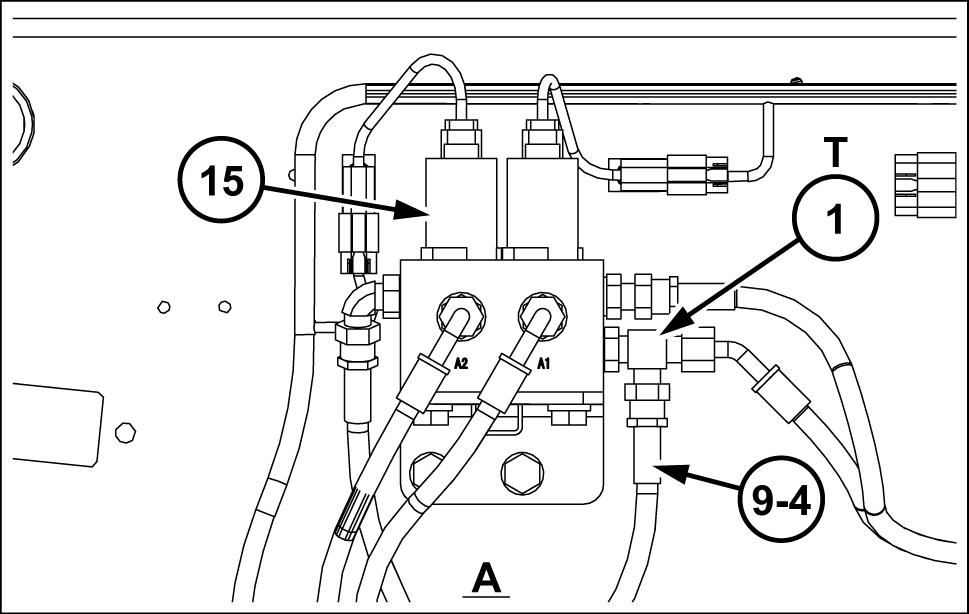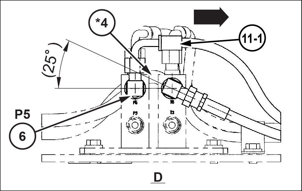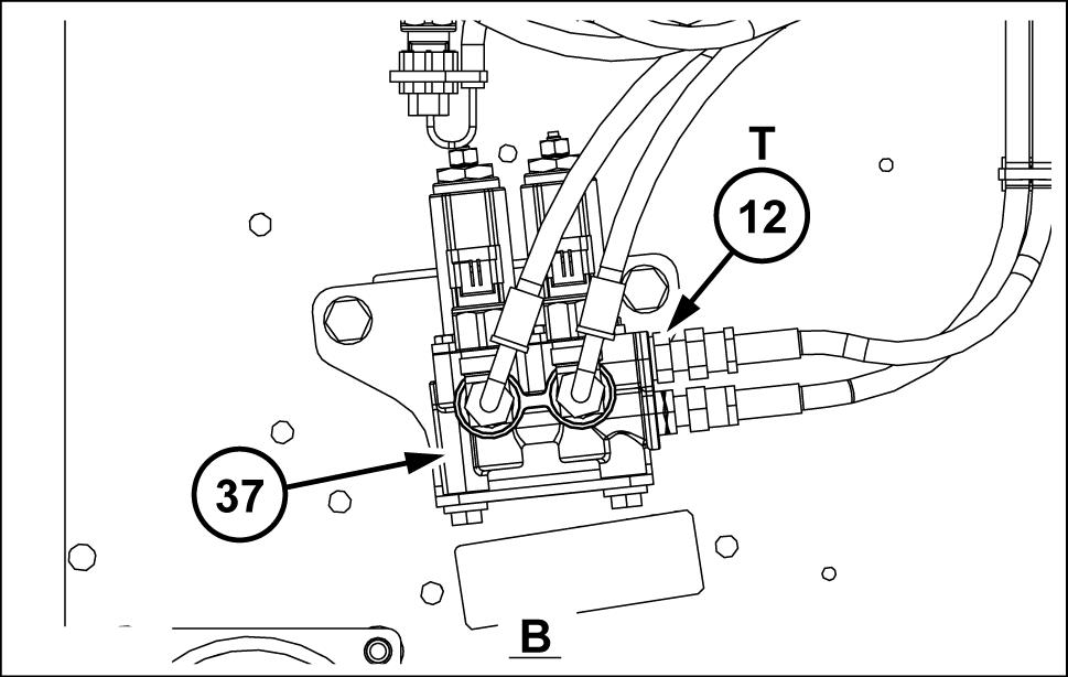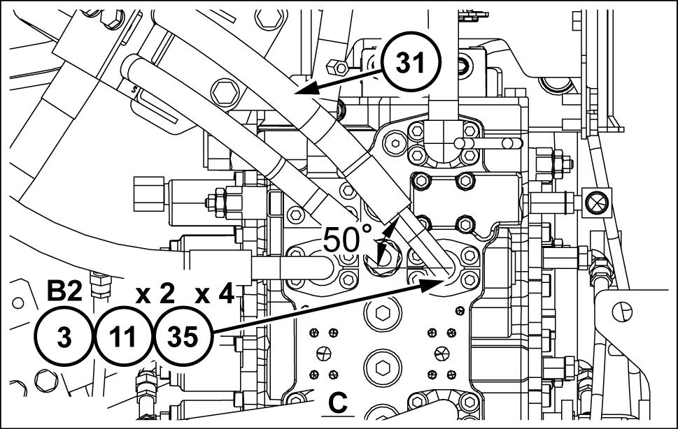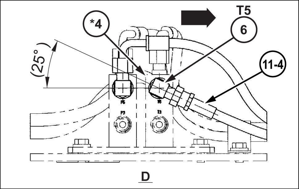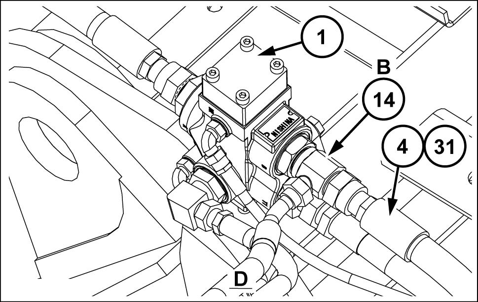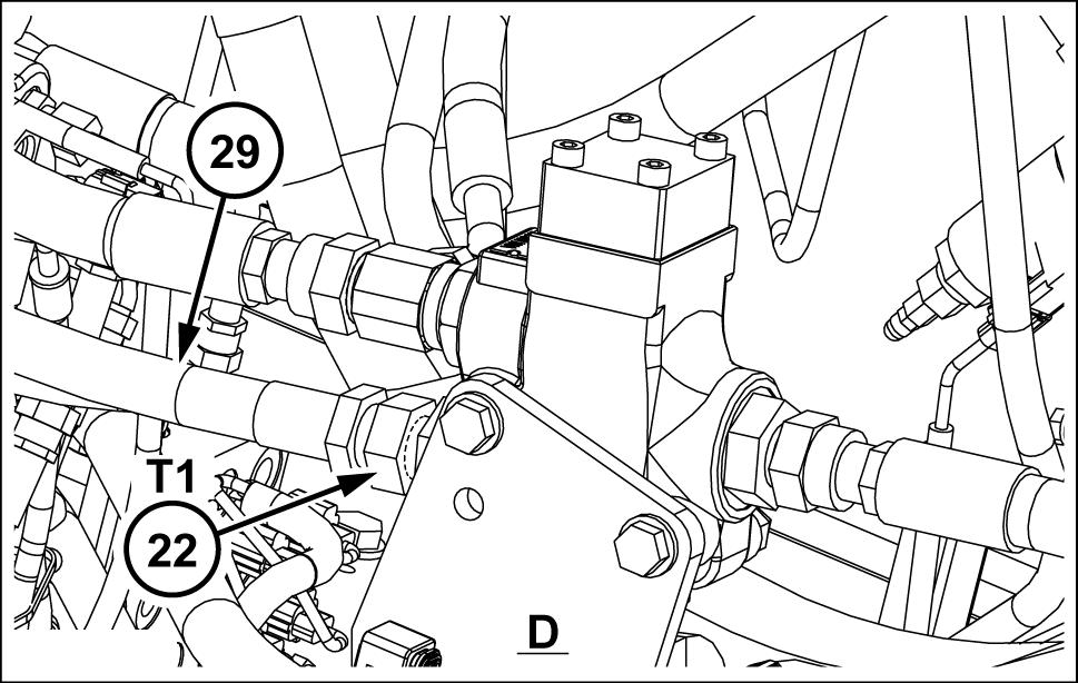 Instale conexión T (14) puerto B válvula tres direcciones (1) Coloque junta tórica (4) racor T (14) e instale manguera hidráulica (31)