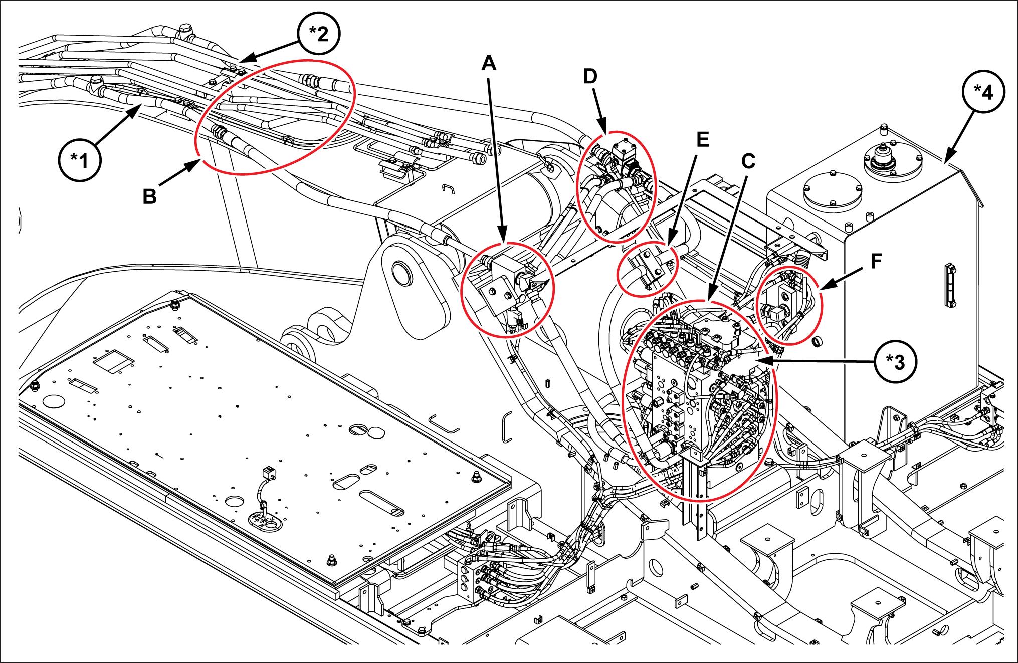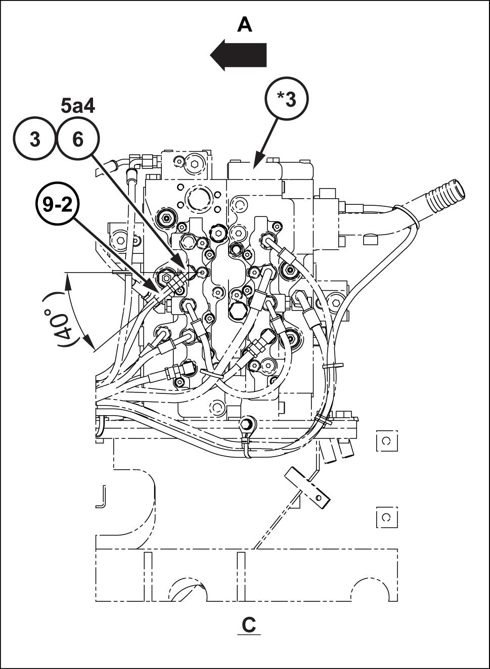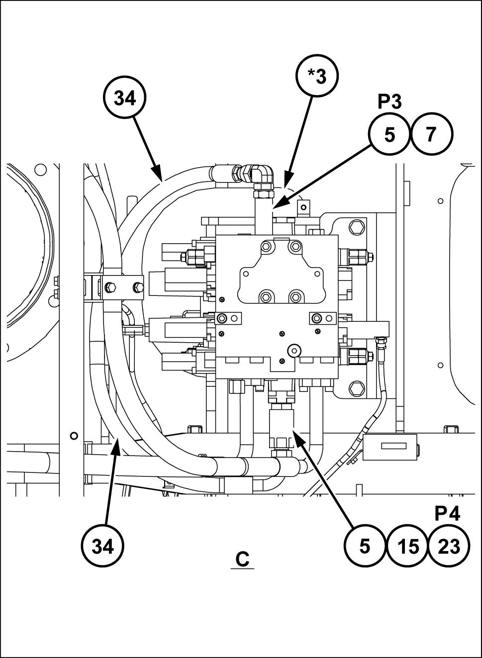 Instale junta tórica (5) adaptador (23) y , a conecte manguera hidráulica (34) Instale codo (7) toma válvula control (*3)