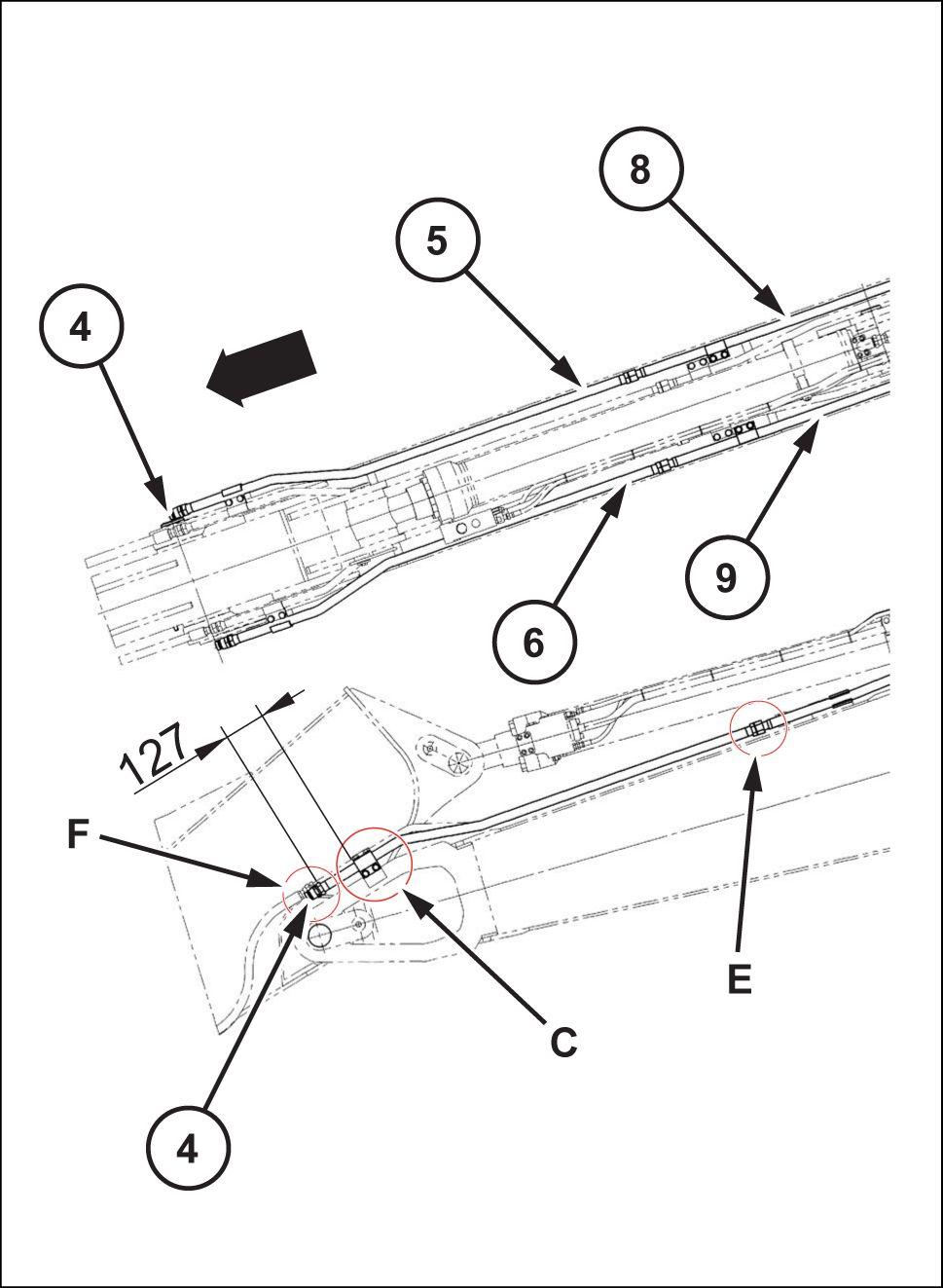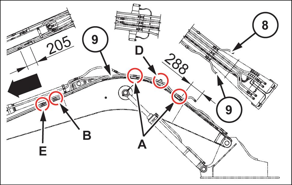 • Apriete las bridas para tubos (2) a 205 ( ) del extremo delantero del conducto quierdo) (9)