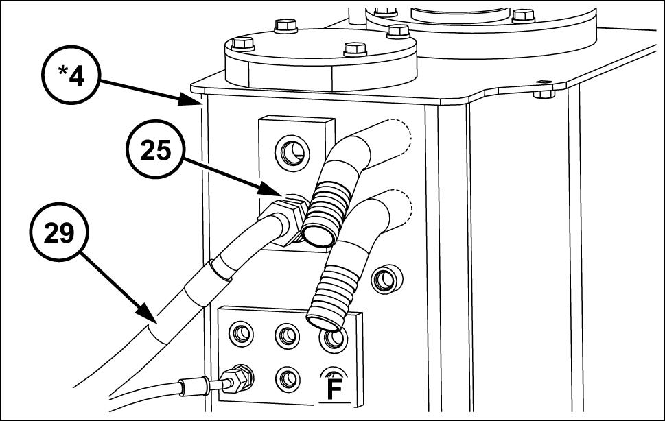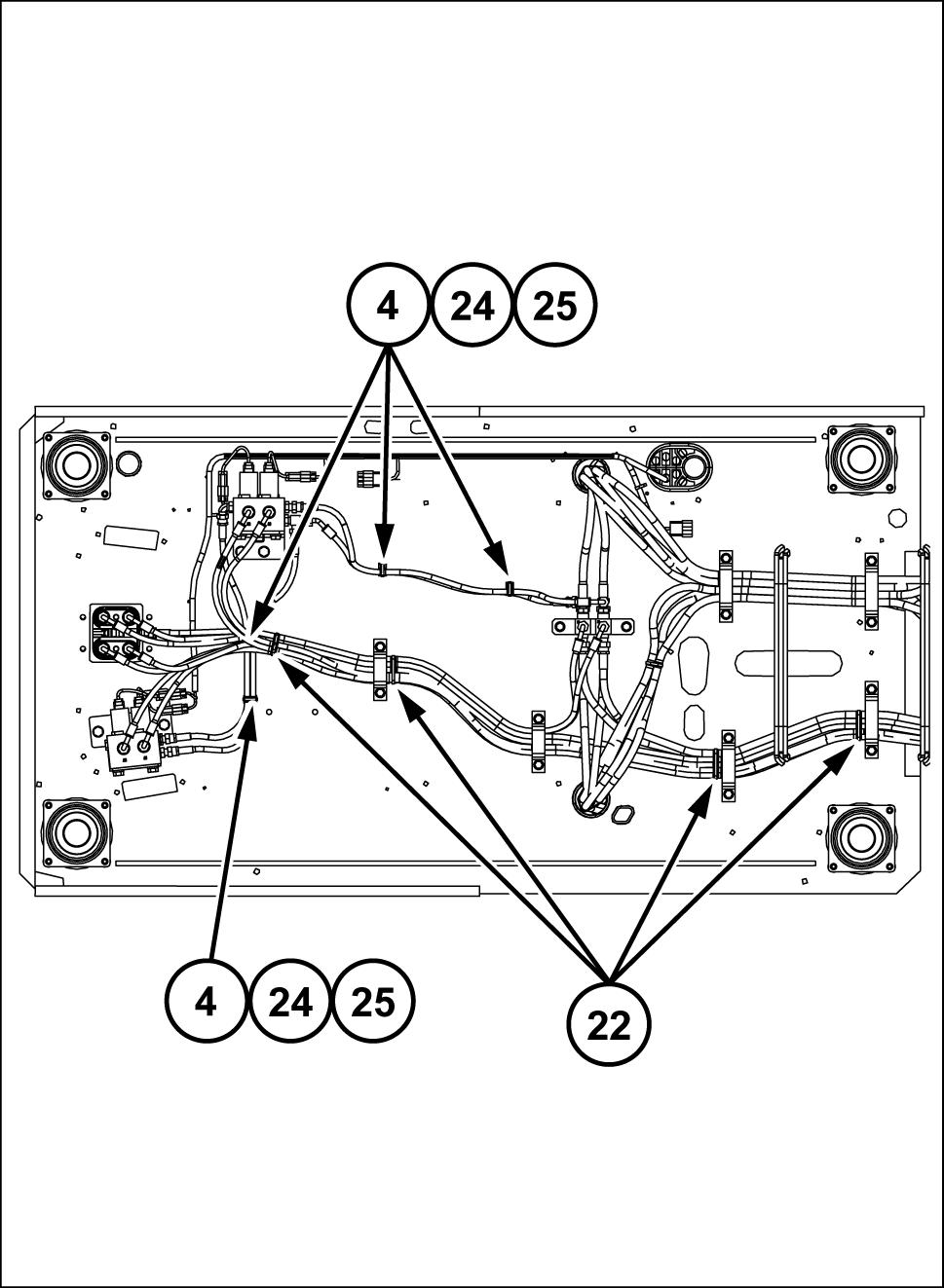 22. Fije manguera del conjunto cuatro puntos con una abrazadera montaje (24) , tornillo cabeza redonda Phillips (25) y una brida (4) cada uno tal como muestra Fije manguito del conjunto con cuatro bridas (22)