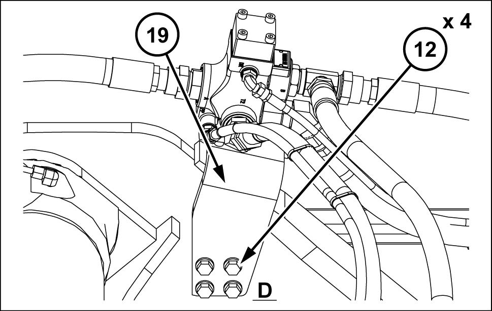 Instale válvula tres direcciones (1) soporte (19) con dos pernos SEMS (12)