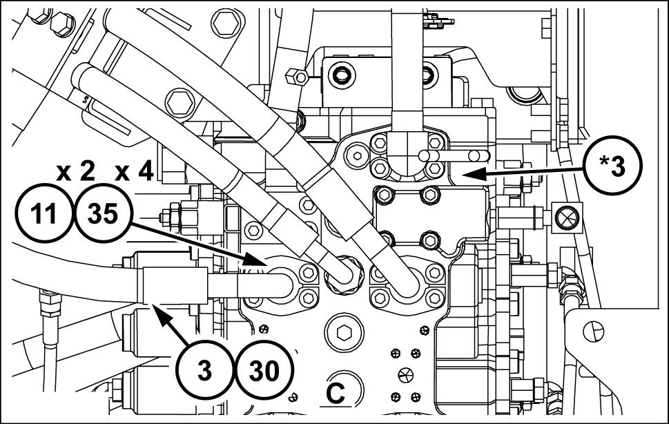 Monte junta tórica (3) toma válvula control (*3) y conecte manguera hidráulica (30) con dos bridas abiertas y cuatro pernos cabeza hueca hexagonal (35)