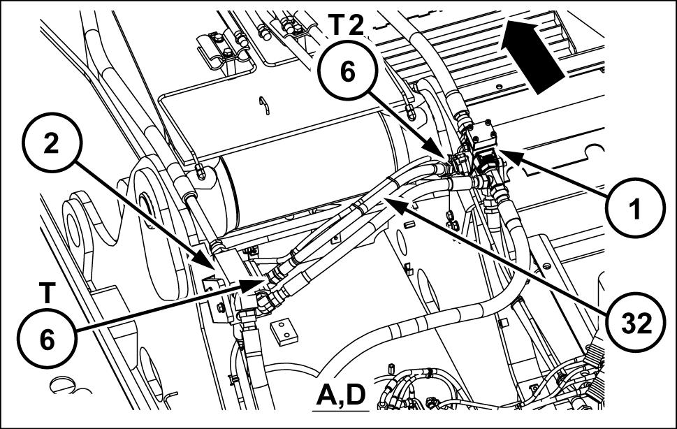 Instale codo (6) puerto T válvula descarga proporcional electromagnética (2) Instale codo (6) puerto válvula tres direcciones (1) Conecte puerto T válvula descarga cional electromagnética (2) y puerto válvula tres direcciones (1) con manguito hidráulico (32)