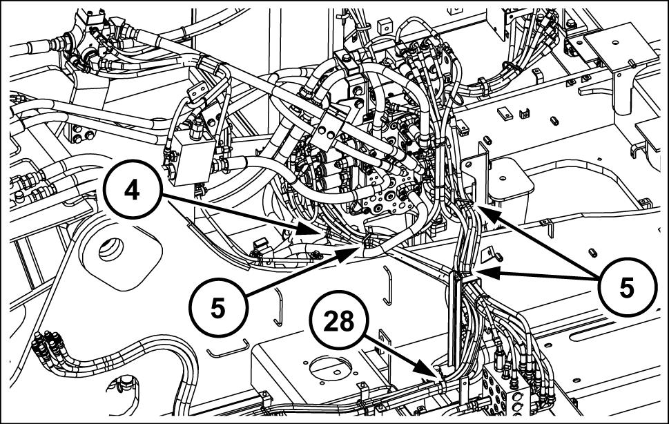 Coloque junta tórica (5) codo (10) y conecte manguera hidráulica (28)