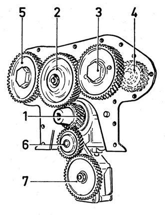 Distributietandwielen. 1. Krukastandwiel 2. Tussentandwiel 3. Nokkenastandwiel 4. Aandrijftandwiel stuurpomp 5. Aandrijftandwiel oliepomp 6. Tussentandwiel oliepomp 7. Oliepomptandwiel