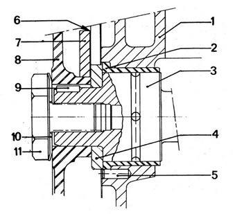 Nokkenas doorsnede, voorzijde. 1. Cilinderblok 7. Centreerring 2. Lagerbus 8. Nokkenastandwiel 3. Nokkenas 9. Spie 4. Drukring 10. Borgplaat 5. Borgpen 11. Bout 6. Vulring