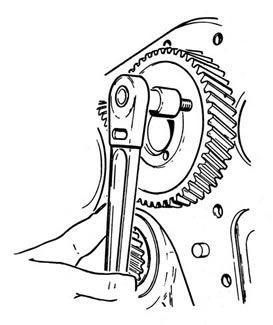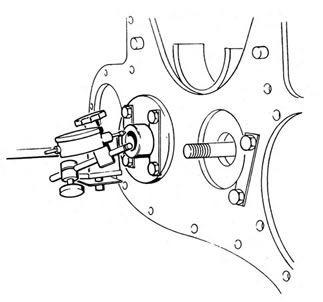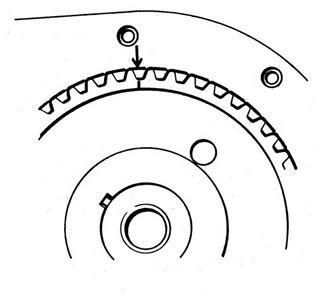 Plaats zuiger 1 in het B.D.P. van zijn compressieslag en monteer het nokkenastandwiel vervolgens zodanig, dat de merkstreep op het tandwiel recht tegenover de pijl op de distributieplaat staat.