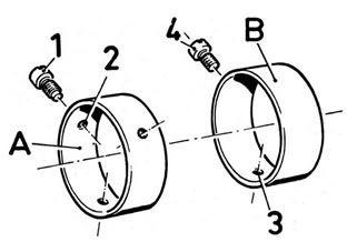 Het aanbrengen van de nokkenas lagerbussen. A. Eerste uitvoering: De beide midden nokkenas lagerbussen A (buitendiam. 64,027 - 64,043 mm) zodanig monteren, dat de pen van de borgbout (1), welke in het daartoe in de cilinderblokwand aangebrachte draadgaten wordt geschroefd, in het gat (2) van de lagerbus steekt. B. Latere uitvoering: Lagerbussen B (buitendiam. 64,0475 - 64,0725 mm) met een zwaardere perspassing behoeven niet te worden geborgd, zodat de desbetreffende draadgaten in het cilinderblok ontbreken. De lagerbussen zodanig monteren, dat het gat (3) komt te liggen tegenover het oliekanaal in het blok t.b.v. de smering van de tuimelaarassen. N.B. Lagerbussen A mogen niet worden tegepast in een cilinderblok zonder draadgaten voor een borgbout. Lagerbussen B mogen wel in het eerste type cilinderblok worden toegepast, mits de desbetreffende draadgaten in het blok worden afgeplugd d.m.v. een bout, welke niet in aanraking komt met de lagerbus.
