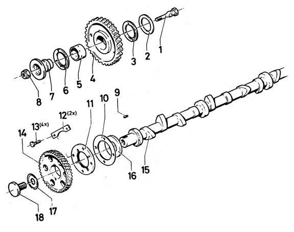 Het instellen van de axiale speling van de nokkenas vindt plaats d.m.v. het aanbrengen van vulringen 6; dikte van de vulring: 0,076 mm.