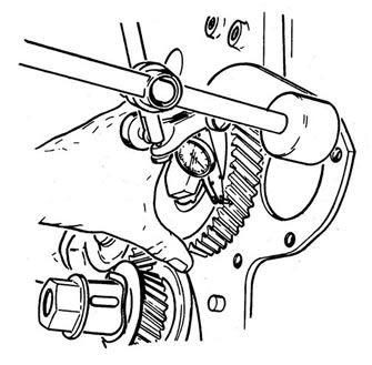 Het meten van de tandspeling van een distributietandwiel, i.c. nokkenastandwiel.