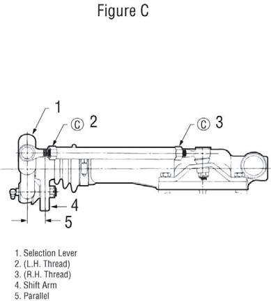Note: Ideally, the shift arm should be adjusted 90° to the selection lever as described, but in some chassis configurations it may be necessary to index the shift arm in the vertical position. Indexing the shift lever is done to prevent shift lever jump out. This type of adjustment will cause an unequal amount of gear shift lever travel between neutral and a forward lever position as compared to neutral and a rearward lever position.